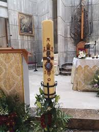 - Lucernario (Bendición del Fuego Nuevo y del Cirio Pascual): Se enciende un nuevo fuego fuera de la iglesia, que simboliza a Cristo como luz del mundo. De este fuego se enciende el Cirio Pascual, un gran velón decorado con símbolos cristianos, que representa a Cristo resucitado. El Cirio es llevado en procesión a la iglesia oscura, y su luz se comparte a las velas de los fieles, simbolizando la propagación de la luz de Cristo. Se canta el "Pregón Pascual", un antiguo himno de alabanza a la Resurrección.